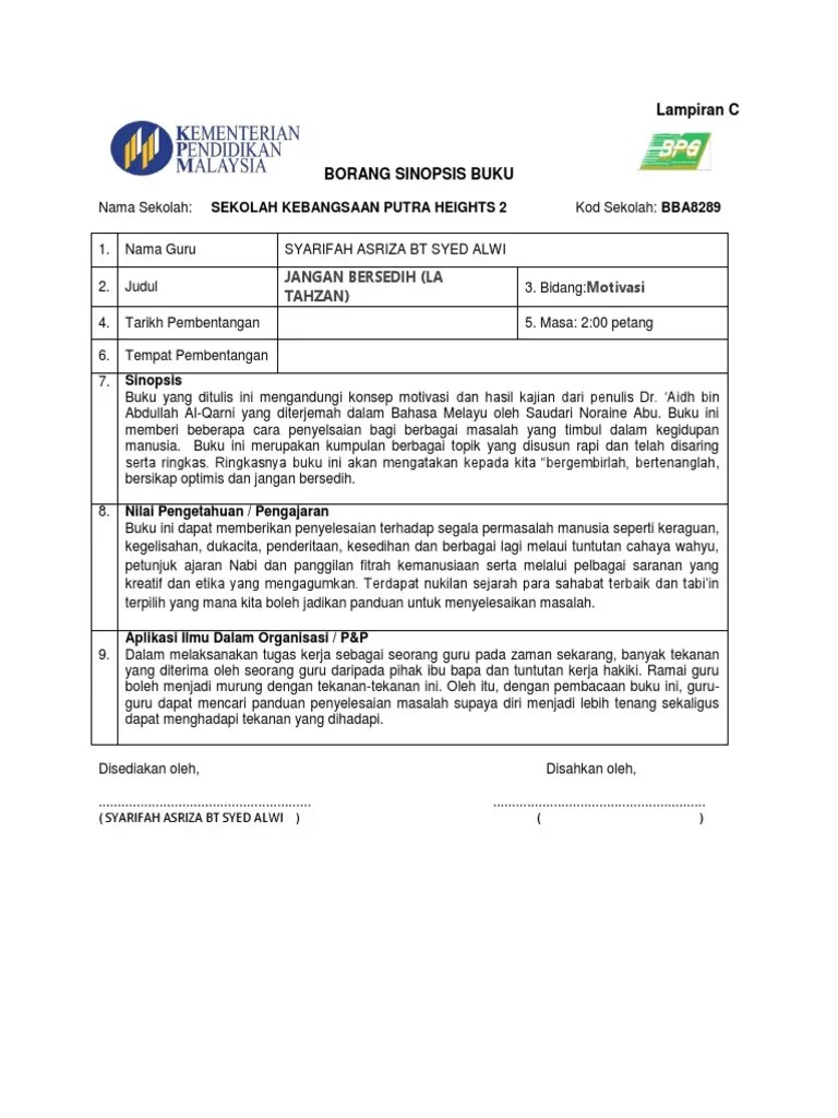 Borang sinopsis kaedah pembacaan buku. Contoh sinopsis novel meniti impian kumpulan contoh makalah doc lengkap. Nama sekolah sk puchong utama 2. Contoh buku review ladap surat r cute766. Sinopsis buku ladap 3 pdf. Book review sinopsis buku ladap 2018 .
